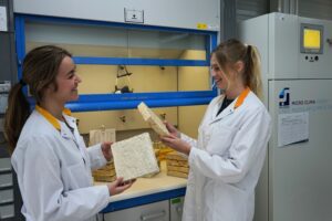 In JRCZ ligt de focus op de analyse van grondstoffen, aangezien de klei uit Zeeland wordt gewonnen en er een bestaande onderzoekslijn rond klei is. De klei wordt hier onderzocht op samenstelling, korrelgrootte, zoutgehalte en andere fundamentele eigenschappen die bepalen hoe het materiaal zich gedraagt in een mycelium-biocomposiet. Neha licht toe: “Het is essentieel dat we eerst goed begrijpen welke kleisoorten geschikt zijn en hoe variabelen zoals vochtgehalte en organische inhoud het eindproduct beïnvloeden. Alleen zo kunnen we later betrouwbare biocomposieten maken.”